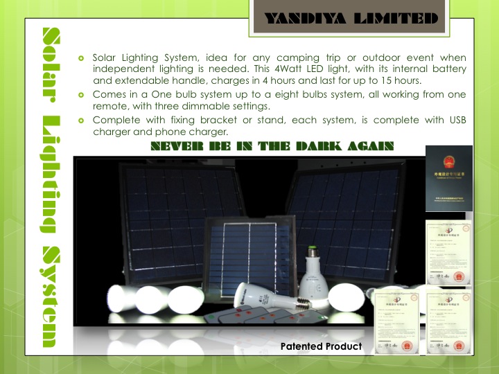 One Bulb LED Rechargeable Solar System is design for people to use in camping or area where power outage occurs. The Solar LED Lighting comes with its own internal battery and can be used as a standard led light or as an emergency rechargeable light. The extendable handle gives it the comfort for a led flashlight as well as emergency lighting.