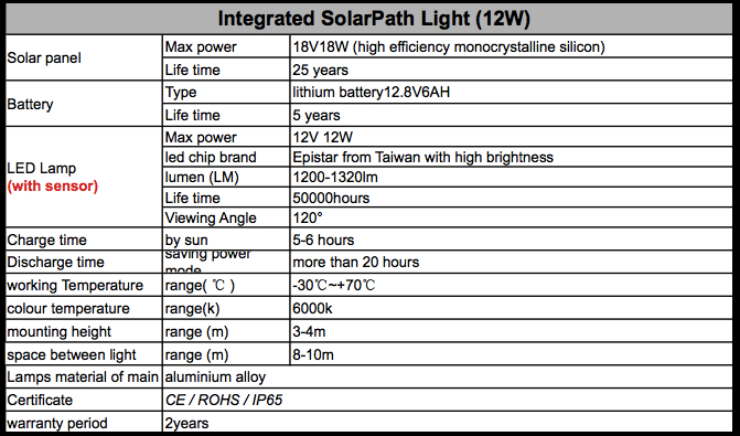 The product is made up with the integrated parts (solar panel, Li-Fe battery, LED, MPPT controller and human intelligence induction system). The solar panel converts sunlight into electricity which is then stored in the Li-Fe battery via controller, the LED light will work in night automatically by light sensor control, and provide light for the dark area, while the human intelligence induction system can save the energy when the lighting is not necessary.